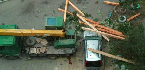 Сегодня на улице Адмирала Юмашева 16г кран уронил доски на припаркованный Terios. К счастью, в момент происшествия в салоне автомобиля никого не было. Информация о пострадавших отсутствует.