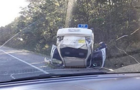 В районе посёлка Мирный по направлению во Владивосток автомобиль с опознавательными знаками службы такси перевернулся на крышу в результате аварии. Информации о пострадавших нет. На месте происшествия работают сотрудники полиции.