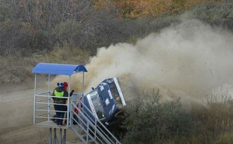 汽车竞赛时发生了大事故:汽车翻筋斗着碰上了裁判员的望台!