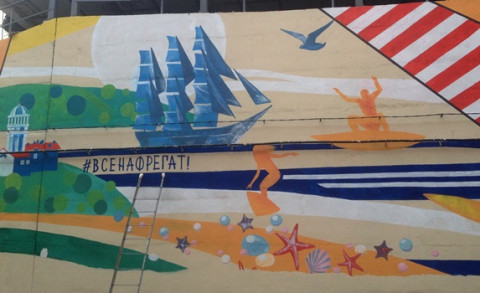 Всю стену художники разделили на три композиционных части. Первую посвятили теме отдыха и морским видам спорта: серфингу, кайтингу, также изобразили парусник «Надежда». Второй сюжет о Золотом мосте. На третьем – круизный лайнер «Принцесса», который часто заходит в бухту Золотой рог.