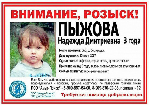 Напомним, ранее ИА Дейта.ру сообщало, что трехлетняя Надежда Пыжова бесследно исчезла 13 июня, в селе Соцгородок Смидовичского района. Несмотря на то, что создан оперативный штаб по розыску ребенка, задействованы силы МЧС, полиции, Росгвардии, более двухсот волонтеров, местные жители, военнослужащие погранвойск, - до сих пор все усилия не принесли результата.