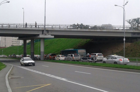 Гигантская пробка образовалась с Русского моста в сторону одноименного острова, сообщает корреспондент ИА Дейта.ру.