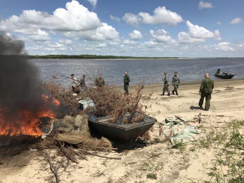 В результате патрулирования на китайском берегу реки Амур обнаружен незаконный рыболовецкий стан, задержано 2 гражданина КНР, уничтожено 2 плавсредства типа «Джонка», около 1000 метров незаконных сетей, изъято около 10 экземпляров крупных рыб, в том числе занесенных в Красную книгу.