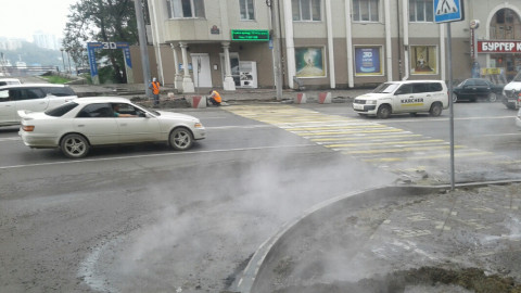 На улице Светланской кипяток бьет фонтаном, рядом образовались лужи медленно остывающей воды. Проходящие мимо жители и гости Владивостока громко выражают свое негодование, относительно горячей воды в центре приморской столицы.