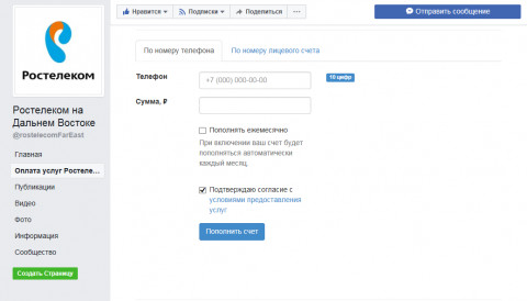 С помощью сервиса можно оплатить интернет, «Домашний телефон» и «Интерактивное телевидение». Для этого необходимо выбрать страницу компании «Ростелеком на Дальнем Востоке» в одной из социальных сетей, заполнить поля в разделе «оплатить услуги» и пополнить счет. Оплата производится по номеру телефона или лицевому счету.