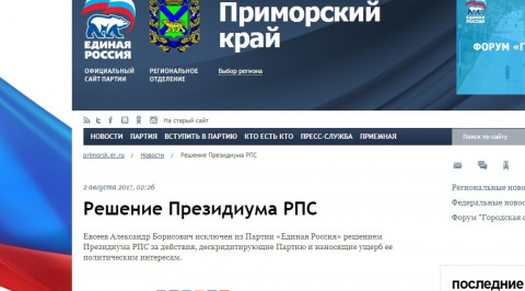 Как сообщили ИА «DEITA.RU» в Приморском региональном отделении партии «Единая Россия», «Евсеев Александр Борисович исключен из партии «Единая Россия» решением президиума РПС за действия, дискредитирующие партию и наносящие ущерб ее политическим интересам».