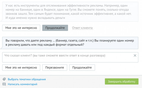 Скрипты дают возможность пользоваться во время разговора с клиентами быстрыми интерактивными подсказками реплик. Считывая свою реплику, переговорщик отмечает в окне диалога ответ клиента, и скрипт предлагает следующее высказывание. Коммуникация, таким образом, строится по заранее разработанному алгоритму, последовательно продвигающему переговоры к цели. На основе скриптов можно строить не только продажи, но и любые другие клиентские взаимодействия — техническую поддержку, консультации, опросы.
