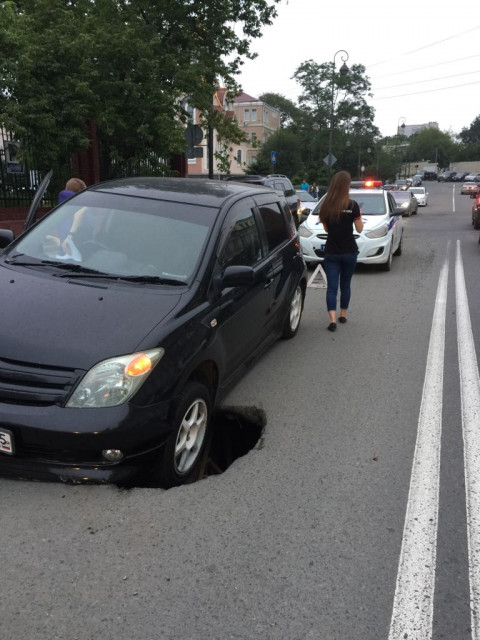 Как сообщает корреспондент ИА «Deita.ru», малолитражка буквально ушла под землю передним колесом.