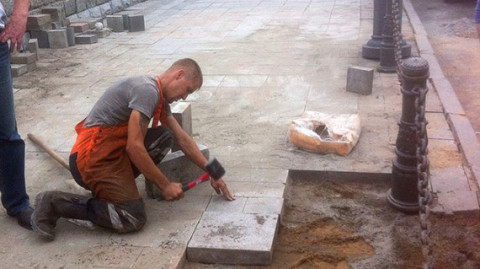 Специалисты демонтировали плиты брусчатки, после чего постелили новое песчано-цементное основание.