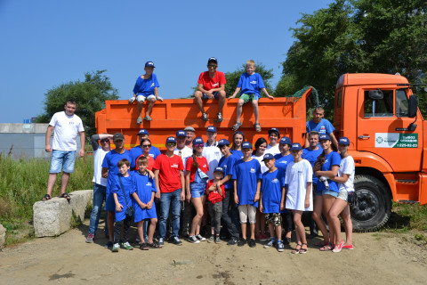 Отправив машины в край, активисты фонда приступили к программе "Чистый дворик" и очистили от мусора пляж на Второй речке.