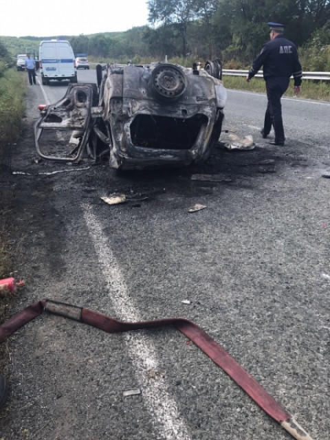 В результате автоаварии произошло возгорание легкового авто. Сотрудники полиции, прибывшие на место происшествия, обнаружили в салоне транспортного средства водителя и двух пассажиров без признаков жизни. Личности погибших устанавливаются.