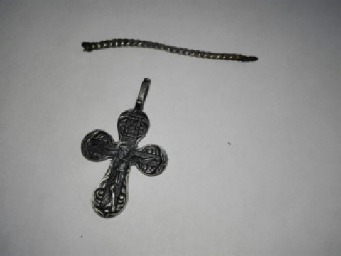 На трупе обнаружен крестик из металла серого цвета (серебра) с фрагментом веревки (на фото).