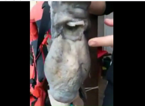 Как рассказывают, очевидцы, у существа два рта, один из которых находится в районе живота. Сам живот похож на огромный пузырь, в котором виднеется нечто желтое. Рыба, если это можно назвать рыбой, темного цвета.