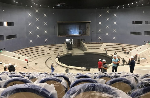 «Так, в зрительном уже зале установлены акустические панели, в амфитеатре монтируется 450 комфортабельных кресел, запущена система освещения. Ведётся установка покрытия манежа. Параллельно начата процедура закупки холодильного и иного оборудования», – сообщили подрядчики, отметив, что в октябре ремонтные работы будут завершены и начнётся сложный пусконаладочный процесс.