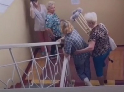 Размещенное в соцсетях видео свидетельствует о том, что травмированные люди вынуждены преодолевать несколько лестничных пролетов, чтобы достичь кабинета врача. Хорошо, если рядом есть родственники, готовые помочь.