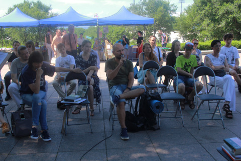 28 июля на верхней площадке Спортивной набережной собрались люди читающие. Здесь прошел книжный маркет «Море Море». Тут же около импровизированной сцены собрались любители литературы, пришедшие на встречу с Котом Бродского. К ним присоединились случайные прохожие, заинтересовавшиеся проходящим литературным действом.