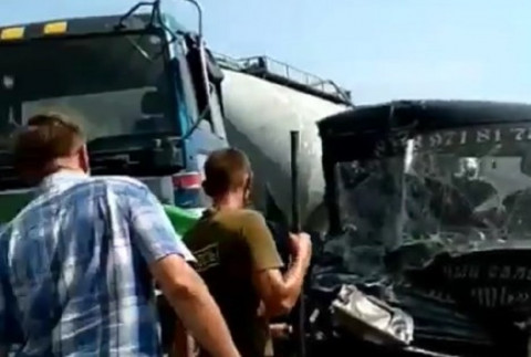 Столкнулись цементовоз, два грузовика, автомобиль ритуальных услуг и легковой автомобиль. По предварительной информации, в жесткой аварии все участники остались живы. Из легкового автомобиля спасатели извлекли зажатого ребенка.