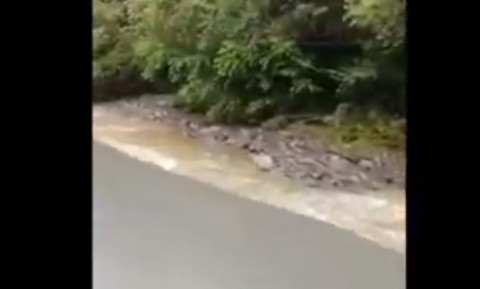 Судя по видео, бурным потоком грязная вода стекает вниз по склону, разрушая асфальтное покрытие. Ближе к пологой дороге «река» меняет направление и уходит в лесной массив. На опасном участке уже установлены ограничительные столбы и закреплена специальная лента.
