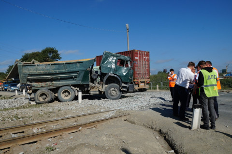 Водитель грузовика с грузом щебня выехал на железнодорожный переезд на запрещающие сигналы светофора перед приближающимся поездом. Машинист поезда применил экстренное торможение, но расстояние было недостаточным, поэтому произошло столкновение.