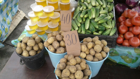 Картофель – 25, 35 и 40 рублей, свекла – 40 и 45 рублей, сорт «бордо» - 50 рублей. Морковь – пучок (4- 6 штук) - 30 рублей, килограмм – 40, 45 и 50 рубелей. Перец сладкий – 74, 80 и 85 рублей, баклажаны – 70, 75 и 80 рублей. Огурцы – 45, 55, 60 и 80 рублей, помидоры (в зависимости от сорта и размеров) – 50, 55, 65, 70, 80, 90, 100 и 120 рублей.