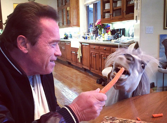 Как оказалось "Железный Арни" владеет очаровательной пони, с которой весело проводит время. На видео он кормит её морковкой и гоняется за ней на велосипеде.