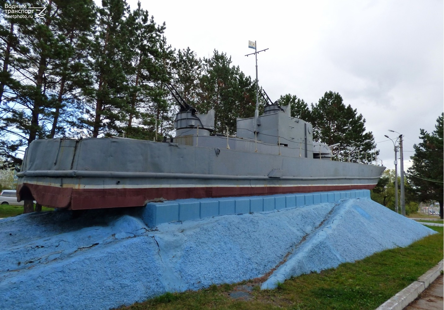 Это судно, ставшее памятником, восстановили в Хабаровске к 9 мая. Перед кораблем возложены цветы.