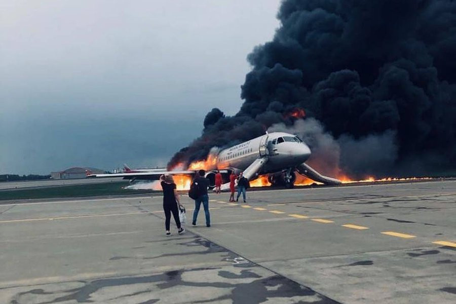 Самолет российского производства загорелся после экстренной