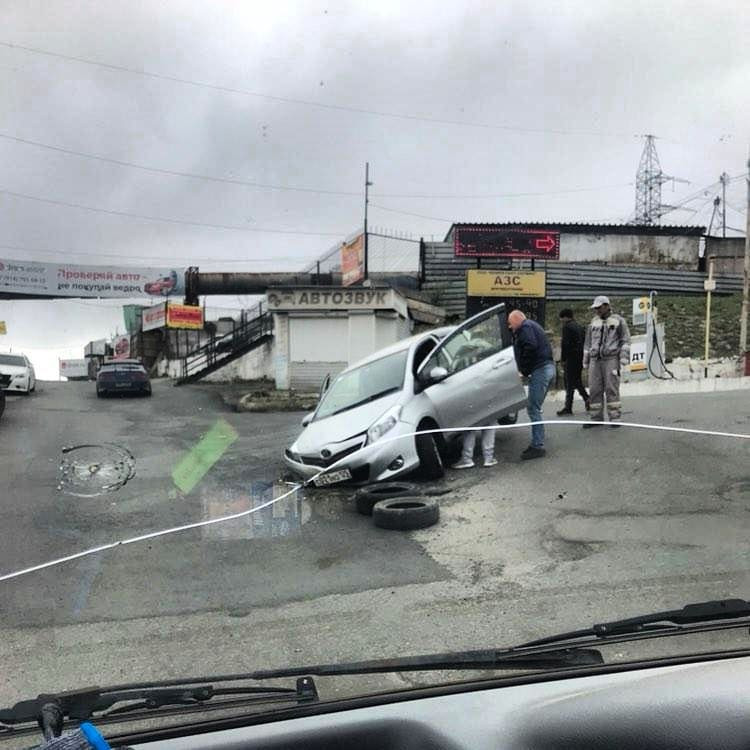 Подобная ситуация произошла накануне во Владивостоке. На выезде с автозаправочной станции в районе Зеленого угла автомобилист заехал в яму. Фотография с места происшествия появилась в паблике dps.control в пятницу, 4 октября.