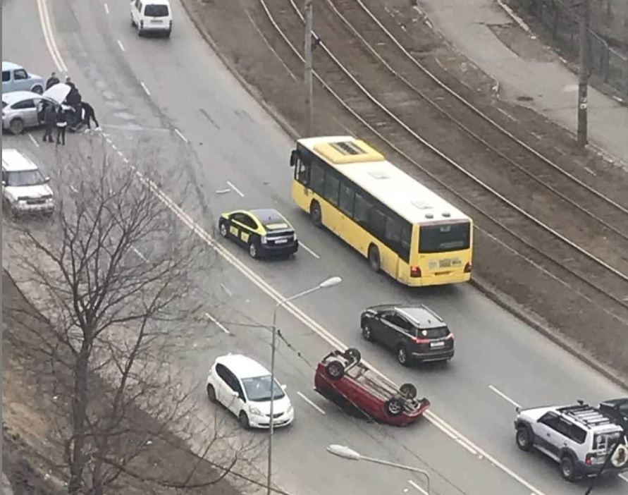 На дороге возле остановки Поликлиника во Владивостоке перевернулся автомобиль. Судя по кадрам, произошло это из-за столкновения с другим авто, сообщает ИА DEITA.RU.