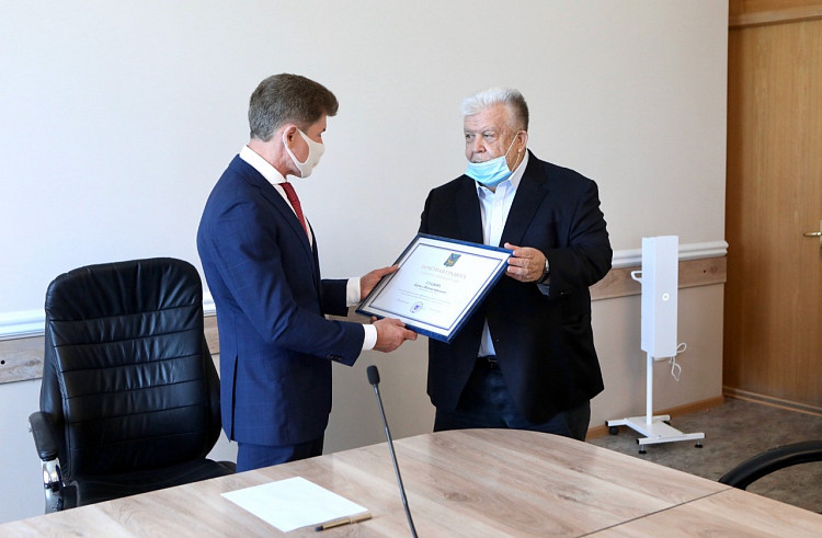 Олег Кожемяко в присутствии депутатского корпуса вручил Борису Гладких Почетную грамоту Губернатора Приморского края за высокий профессионализм, эффективную работу, компетентность и личный вклад в развитие Находкинского городского округа.