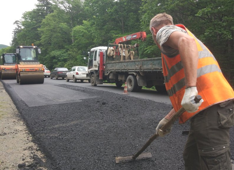 Сейчас на мосту через реку Артемовка дорожные строители уже заканчивают укладывать асфальт, а на подъездах к мостовому сооружению асфальтобетонное покрытие уже уложено.
