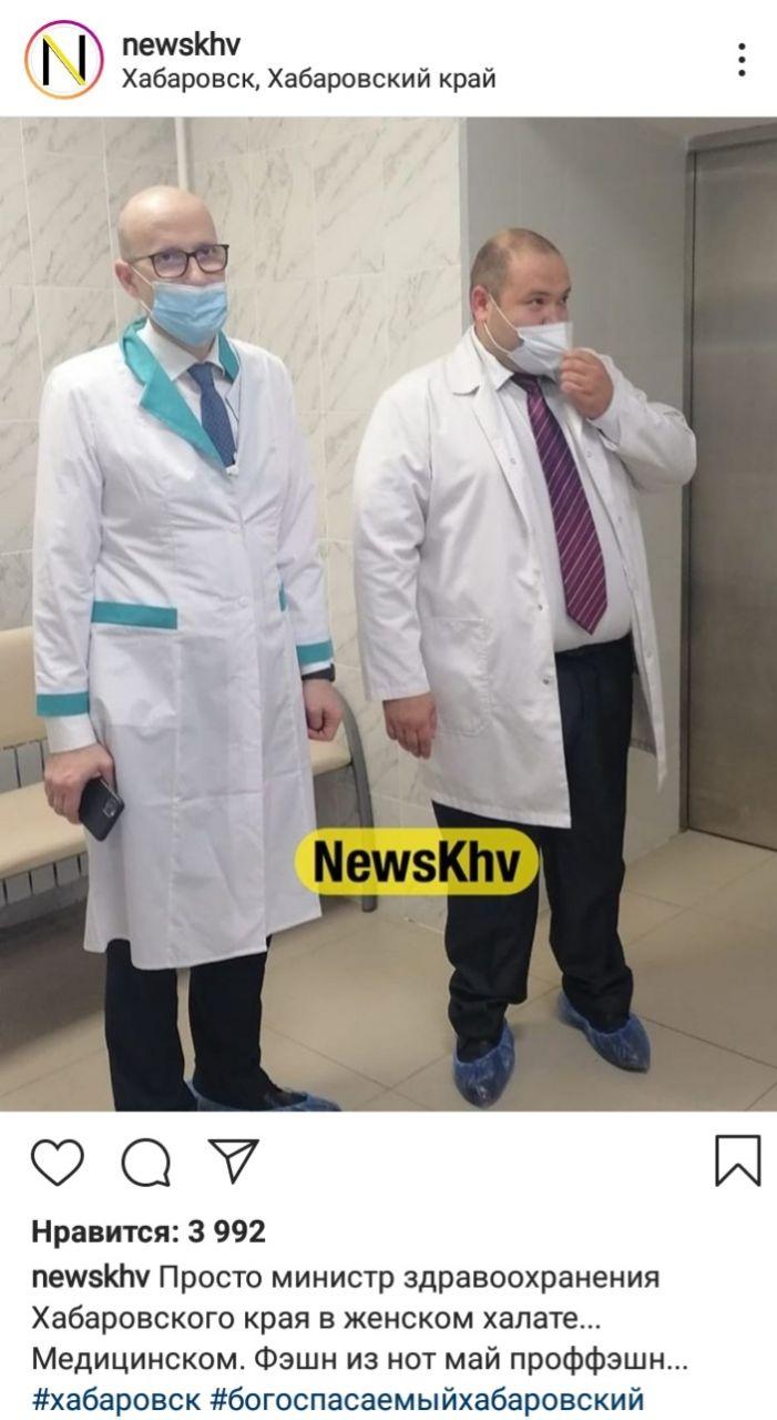 Чиновника запечатлели в женском медицинском халате во время посещения одной из больниц Хабаровска. Рядом с ним - коллега, но он одет согласно гендерной классификации - в мужскую врачебную накидку.