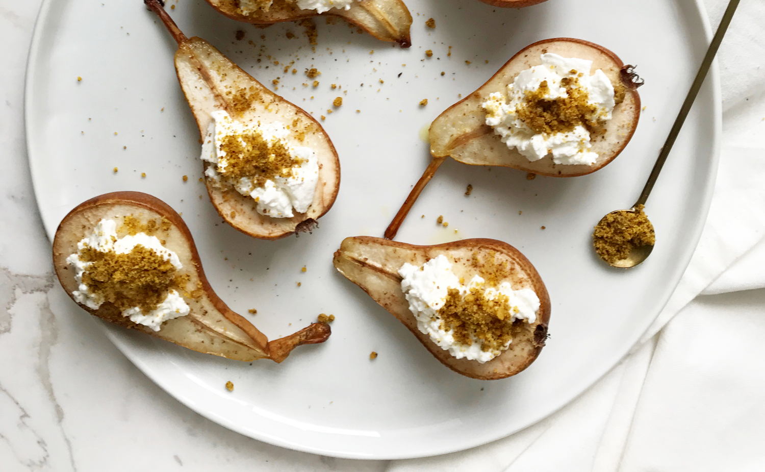 Разрежьте груши пополам. Очистите от косточек. Отдельно смешайте мёд с рикоттой.