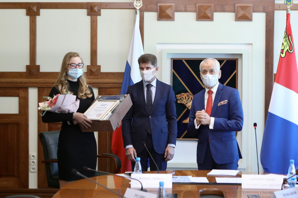 Добавим, что приморские школьники приняли участие во всероссийской акции «Здоровое питание – активное долголетие», реализуемой партпроектом «Здоровое будущее». Они проводили уроки об основах правильного питания и ведения здорового образа жизни в младших классах, вели практикумы по изучению влияния продуктов питания и типов физической нагрузки на организм и продолжительность жизни. Геннадий Онищенко вручил Диплом победителю конкурса «Лидер» акции «ЗОЖ – путь к успеху» ученице 10Б класса МБОУ СОШ №7 «Эдельвейс», г. Находка Юлии Боровиковой и ее преподавателю Людмиле Голубевой. Юлия провела уроки ЗОЖ среди сверстников, сделала исследовательский проект о влиянии питания и спорта на внешний вид и успеваемость. Девушка также награждена путевкой в Артек.