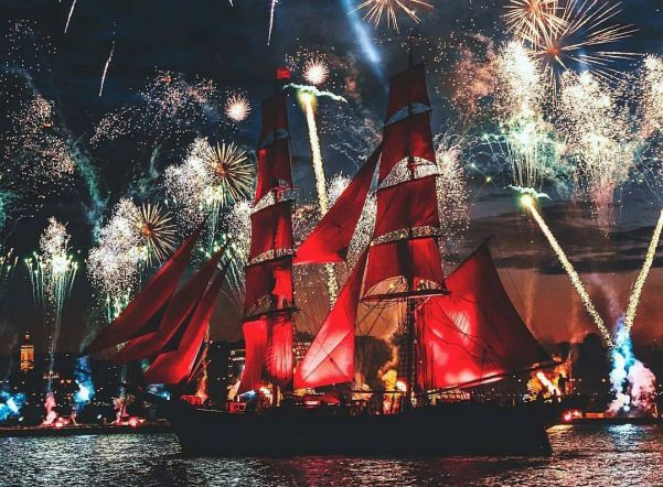 Как известно, в Северной столице праздник проходит в июне, он приурочен к школьным выпускным. Гостями мероприятия являются выпускники и их близкие родственники, а также учителя. Попасть на праздник можно по специальным приглашениям, билеты в свободной продаже отсутствуют. Начинается мероприятие с концерта на Дворцовой площади, затем гости любуются пиротехническим шоу на Неве. Под фейерверки по реке проходит корабль с алыми парусами.