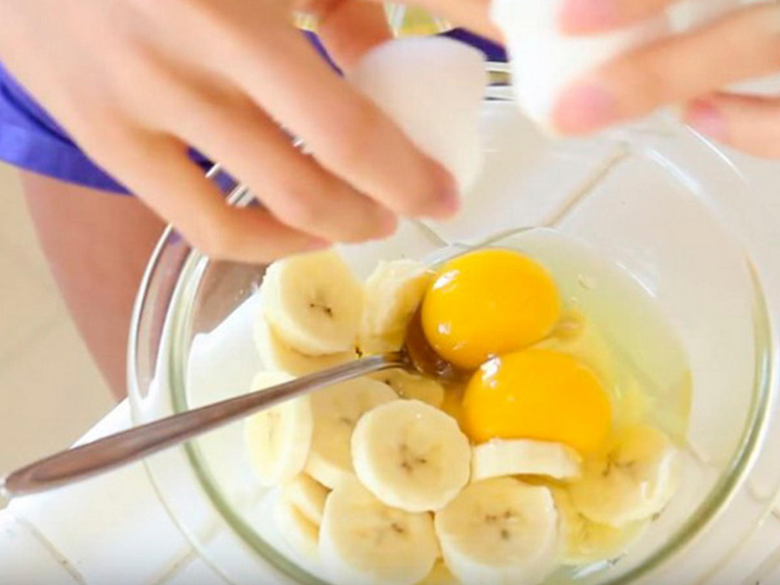 Бананы нарежьте кружочками и обжарьте с двух сторон на сливочном масле. Яйца взбейте с молоком, сахаром и мукой. Жарьте 3-4 минуты под крышкой.