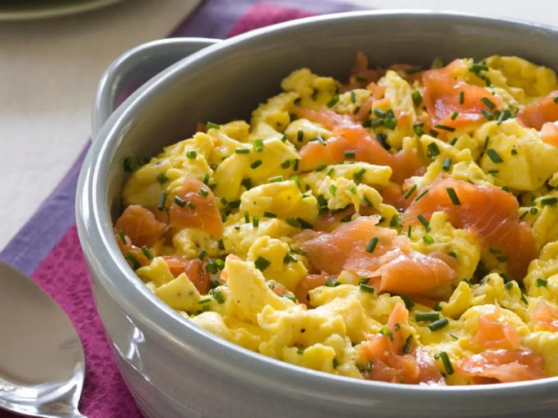 Смешайте яйца со сливками, добавьте соль и взбивайте 5 минут. На сковороде растопите сливочное масло, влейте туда взбитую смесь и готовьте на медленном огне, постоянно помешивая в течение 2х минут. Текстура яичницы должна быть бугристой.