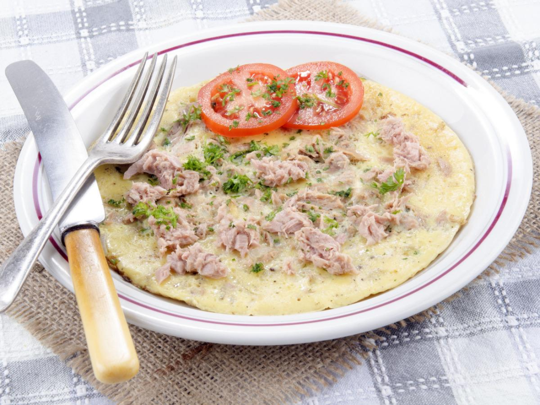 Мелко нарежьте лук и поджарьте 2 минуты. Тунец без жидкости добавьте и обжаривайте с луком 5 минут. Разбейте яйца и взбейте венчиком. Добавьте специй и зелени. Отправьте в духовку на 15 минут при температуре 180 градусов.