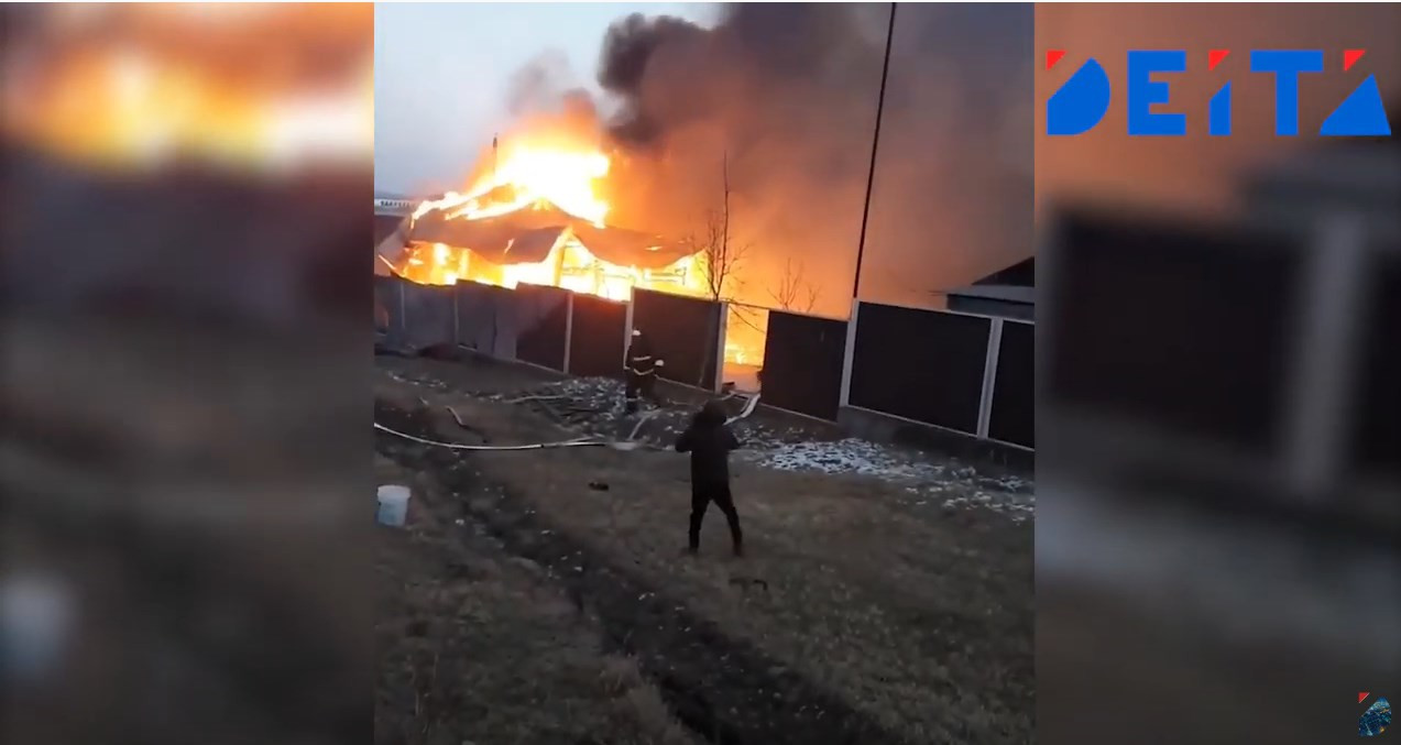 Автор видеоролика комментирует происходящее, отмечая, что на базе отдыха загорелась баня. При этом мужчина за кадром сетует, что выдался сложный день, так как только потушили одно возгорание, произошло следующее. Далее, по словам автора видеоролика, пламя перекинулось на другое строение.