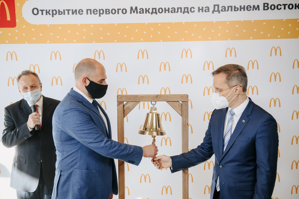 Во время торжественного открытия первого предприятия Макдоналдс на Дальнем Востоке было подписано соглашение о сотрудничестве. Марк Карена, генеральный директор Макдоналдс в России и Константин Шестаков, заместитель председателя правительства Приморского края, курирующий вопросы экономического развития, подписали соглашение, и затем открыли первый дальневосточный Макдоналдс в традициях города у моря – ударом в колокол. Марк Карена рассказал о планах предприятия уже в следующем году наладить экономические отношения как минимум с одним поставщиком, расположенным на территории Дальнего Востока.