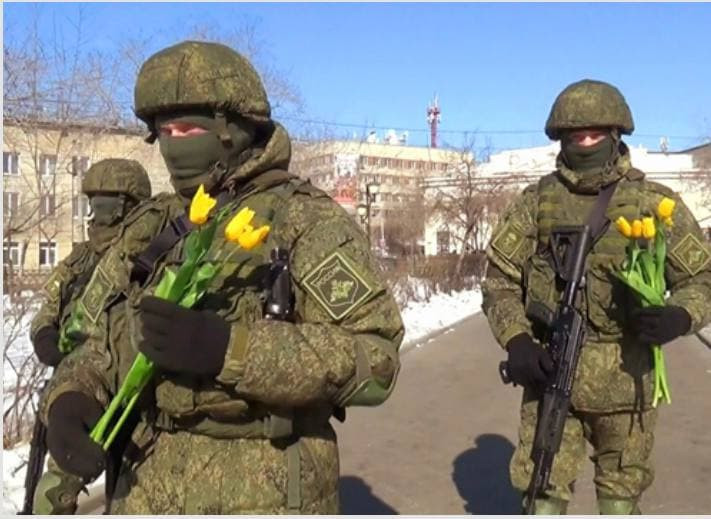 «Военнослужащие поздравили горожанок с наступающим праздником и подарили им букеты весенних тюльпанов», — говорится в сообщении.