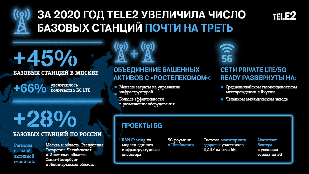 Двузначные темпы строительства сети. По итогам 2020 года компания увеличила число базовых станций всех технологий на 28%, количество БС LTE – на 55%. Регионами с самой активной стройкой стали Москва и область, Республика Татарстан, Челябинская и Иркутская области, Санкт-Петербург и Ленинградская области. В Московском регионе общее число базовых станций выросло на 45%, при этом количество БС LTE увеличилось на 66% (включая довесы оборудования). В 2020 году Tele2 успешно завершила реализацию проекта «LTE на каждый сайт». Его результатами стало наличие базовых станций 4G на всех площадках, включая все значимые населенные пункты с населением свыше 10 тыс.