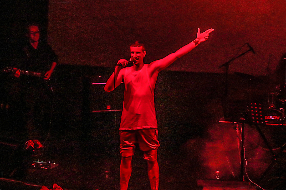 На сцене четверо: трое музыкантов – две гитары, ударные, и Маяковский – поэт-футурист в исполнении режиссёра Ивана Синицына. Видео- образы в решении, достойном творчества художников-футуристов, коим, в том числе, был и Владимир Маяковский, задают ритм визуальный. Прав зритель: восприятие непростого творчества поэта и художника складывается здесь из общего впечатления, сплетающегося из трёх компонентов: слово, музыка, оживший графический ряд. Ритм жизни–поэзии Маяковского решен в двух плоскостях: актёр Иван Синицын читает историю жизни поэта по воспоминаниям, записанным самим Владимиром Маяковским, затем резкий поворот – актёр надевает на голову маску-шлем, и вот уже рубящим ритмом со сцены льются стихи. Не школьная программа, хотя и она тоже. Но кто знает любовную лирику Маяковского? Наверняка многие слышали о скандальных отношениях Маяковского с Лилией Брик. А стихи, посвящённые ей, читали? Что чувствовал тогда Владимир-поэт?