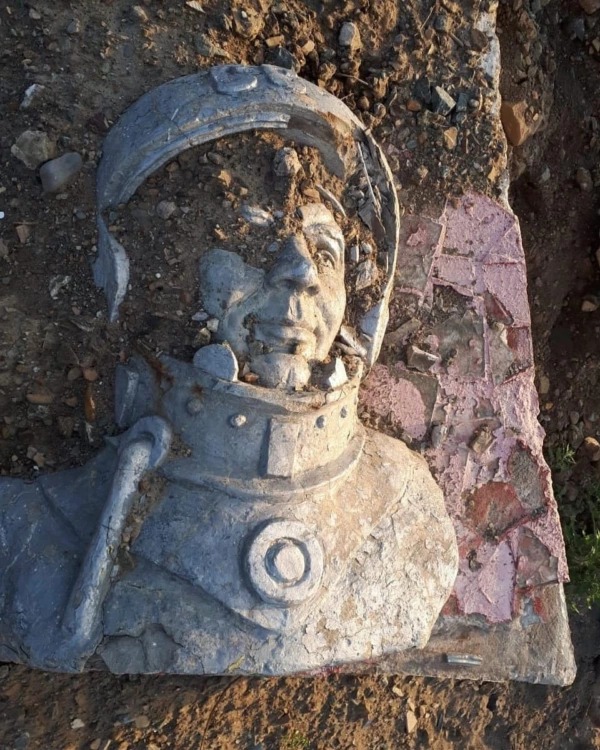 Бюст космонавта валяется среди иного строительного мусора. По словам администрации города, памятник действительно был демонтирован, так как находился в аварийном состоянии.