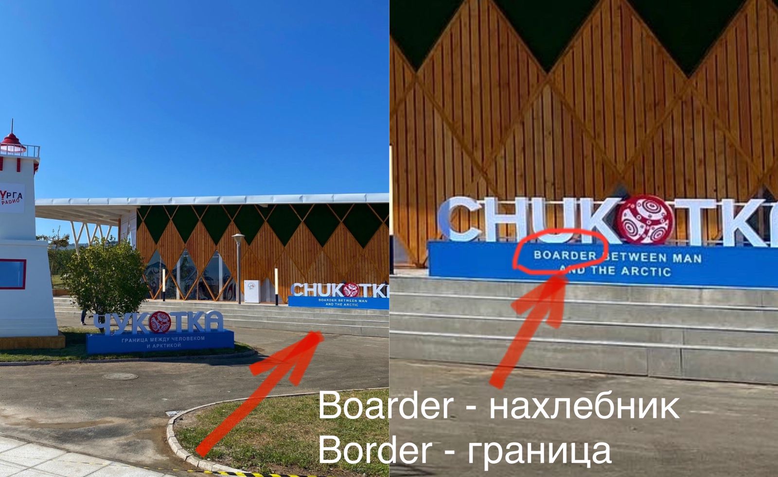 В описании чукотских павильонов указан слоган: «Чукотка – граница между человеком и Арктикой». Авторы инсталляции уверены, что по-английски это будет звучать как «Boarder between man and the Arctic». На первый взгляд, никаких проблем. Однако дьявол, как известно, в мелочах.