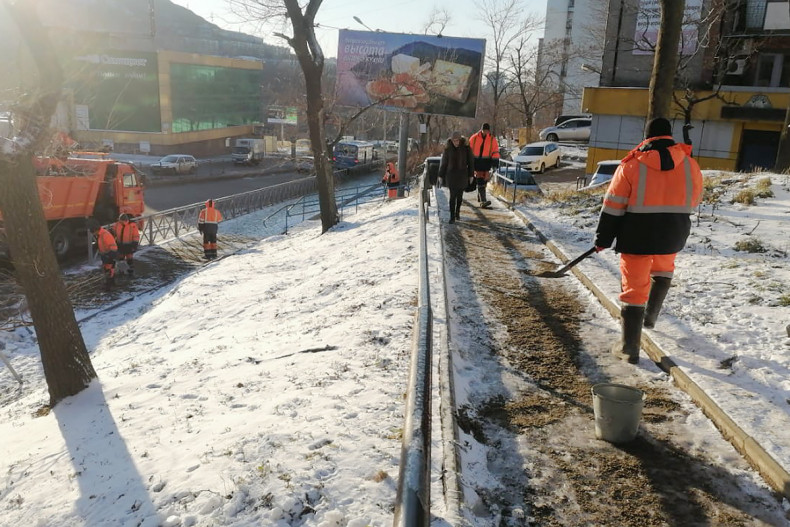 Муниципальные предприятия и пять привлеченных организаций сегодня чистят тротуары в столице Приморья, сообщает ИА DEITA.RU.