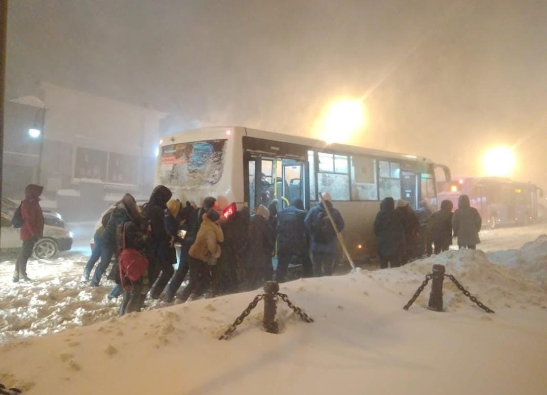 Не только буксирование спасателей МЧС, но и силы простых людей приходится прикладывать, чтобы спасать транспорт из снежной бури.