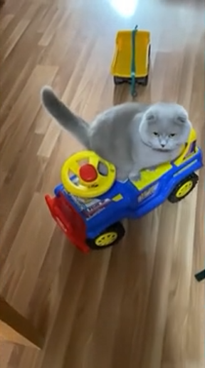 По словам Ангелины, о пристрастии кота к игрушечным машинкам она узнала случайно, услышав ночью подозрительный грохот – оказалось, это Крис гоняет по комнате самосвал, стоя передними лапами в кузове. Но он любит, и когда его катает на игрушечной машине человек.