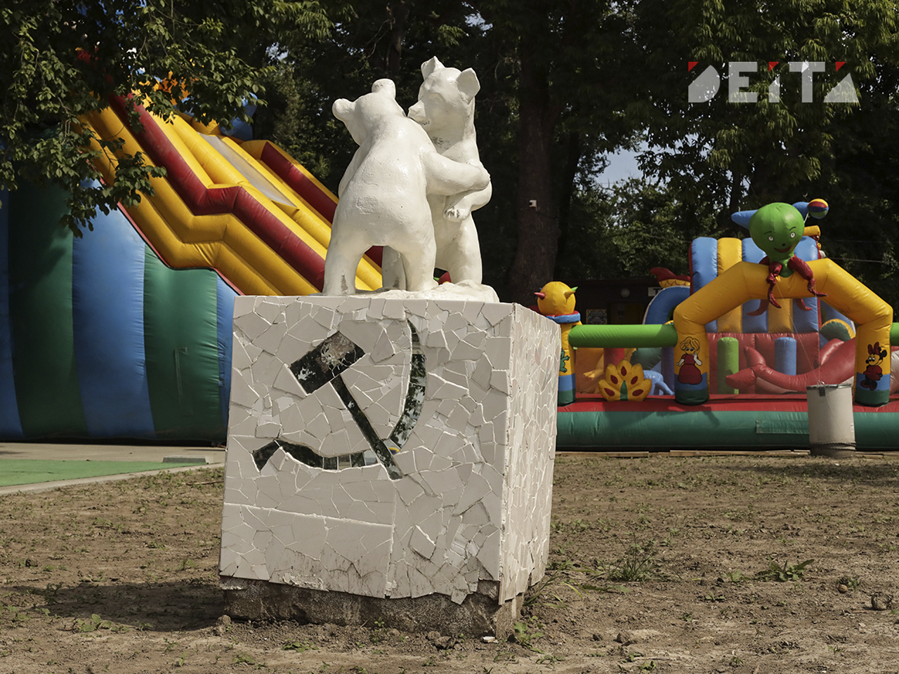 Удивила метаморфоза, произошедшая с милым наследием советской парковой культуры - скульптурой борющихся медвежат, её помнят все поколения владивостокцев, когда-либо отдыхавших в этом месте. На скульптуре появилось новаторство, не имеющее исторической подоплёки: на постаменте “нарисовался” серп и молот из наклеенных кусков зеркал. Прям серпом да по глазам: пляж, солнце и яростно сияют зеркала. Постамент облицевали кусочками из плитки. В советское время такую технику оформления применяли "по бедности", материалов-то не было. Сейчас это выглядит кичем и самодеятельностью и по исполнению, и по содержанию - исторически на “медвежатах” серпа не было, и никакой символики не было, как и плитки. При этом скульптура перекошена на бок, зеркальные куски частично разбиты. Возникает вопрос, когда и по чьей инициативе добавили этот новодел и вернут ли скульптуру в первоначальное состояние?