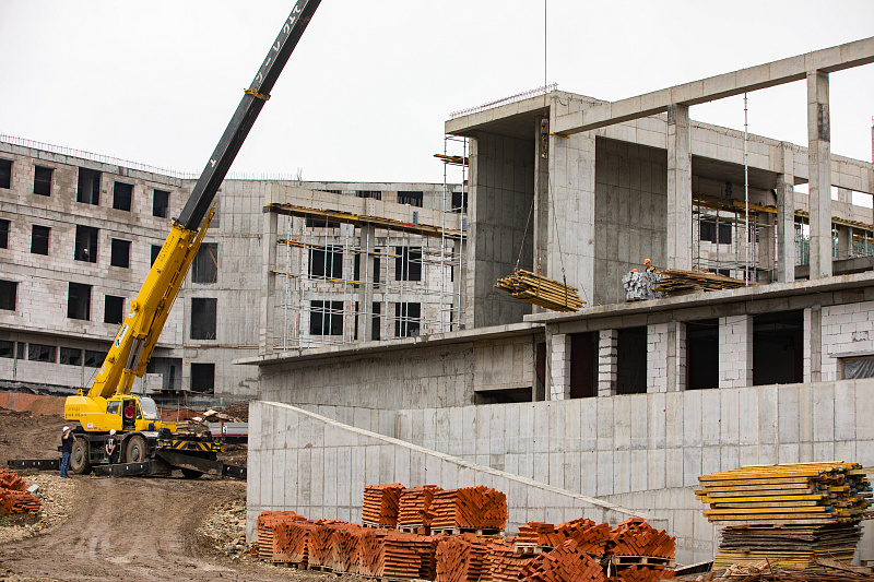 Работы по установке внутренних перегородок в трёх секциях первого учебного корпуса на данный момент завершены, произведена закупка вентиляционного оборудования, сейчас рабочие трудятся в корпусе, где будет бассейн и актовый зал – устанавливают балки. На следующей неделе планируется начать устанавливать перекрытия.